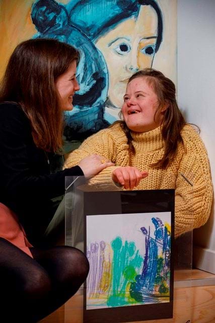 Nynne og Lea - Lea holder et af sine egne malerier, mens billedet i baggrunden af malet af deres mor - Foto Hans Juhl