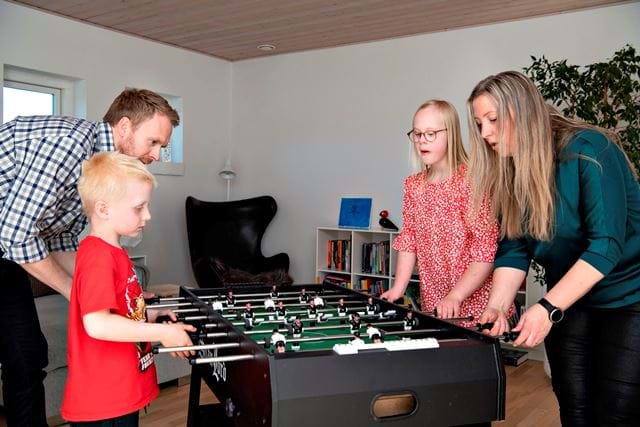 Emmys familie kan godt lide at være sammen om aktiviteter og spil. Her er det en gang bordfodbold i stuen med mor, far, lillebror Frederik og Emmy. Pigerne mod drengene.