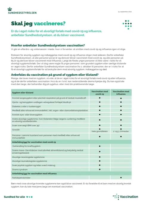 Alle danskere over 50 år bliver tilbudt en gratis booster-vaccine mod COVID-19 fra 1. oktober 2022. Tilbuddet gælder også for borgere under 50 år med særlige sygdomme, for eksempel alle med Downs syndrom.