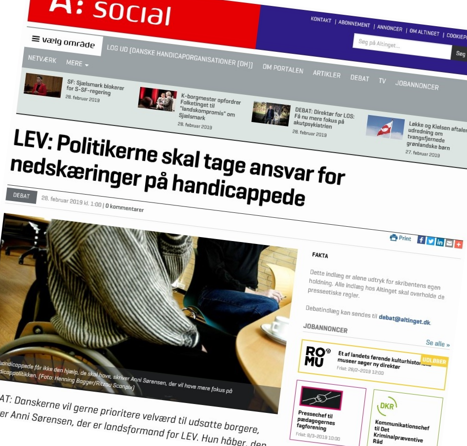 Danskerne vil gerne prioritere velværd til udsatte borgere, skriver Anni Sørensen, der er landsformand for LEV. Hun håber, den kommende regering vil tage mere ansvar for handicappede borgere.