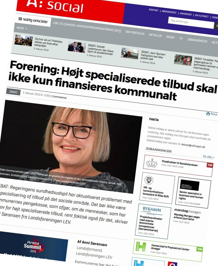 Regeringens sundhedsudspil har aktualiseret problemet med afspecialisering af tilbud på det sociale område. Det bør ikke være kommunernes pengekasse, som afgør, om de mennesker, som har behov for højt specialiserede tilbud, rent faktisk også får det, skriver Anni Sørensen fra Landsforeningen LEV.