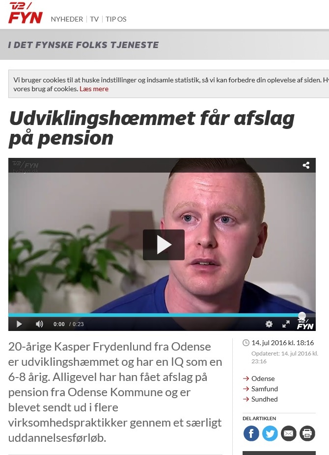 Kasper Frydenlund har forgæves ansøgt om at få førtidspension. Han er udviklingshæmmet og læger og neurologer har vurderet, at han burde have pension, fordi hans arbejdsevne er så lav, at han aldrig vil kunne forsørge sig selv. Det samme har de arbejdspladser, hvor Kasper har været i praktik, vurderet. Og det er både Kasper og hans mor, Lone Sundahl, helt enige i.